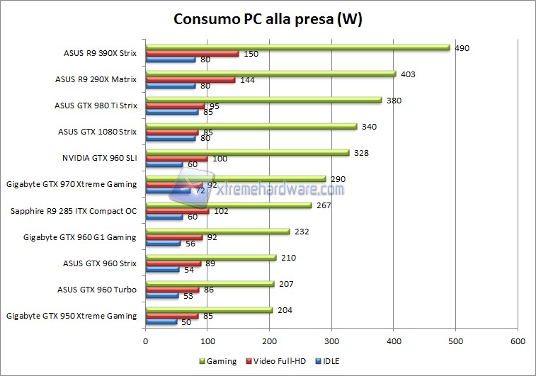 Abbiamo comparato i consumi di questa scheda video con altre VGA che abbiamo recensito ultimamente in modo da indirizzarvi meglio nell’acquisto, vi lasciamo il grafico per una migliore illustrazione: